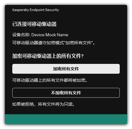 应用策略后,当用户连接可移动驱动器或可移动驱动器已连接时,Kaspersky Endpoint Security 会提示用户确认执行加密操作(请参见下图)。