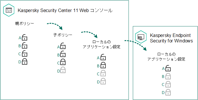ポリシーは管理対象コンピューターのグループを対象に作成され、アクティブまたは非アクティブにできます。アクティブなポリシーの設定は、同期中にクライアントコンピューターに保存されます。1 台のコンピューターに複数のポリシーを同時に適用することはできません。各管理グループでアクティブにできるポリシーは 1 つの製品につき 1 つのみです。