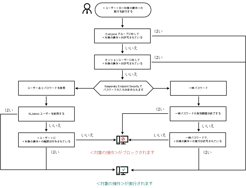 Kaspersky Endpoint Security は次のアルゴリズムに従って、パスワードによって保護されている処理の実行を許可するかブロックするかを判定します。