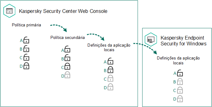 Deste modo, as definições do Kaspersky Endpoint Security serão configuradas nos computadores cliente durante a seguinte sincronização. Pode consultar informações sobre a política que está a ser aplicada no computador na interface do Kaspersky Endpoint Security clicando no botão