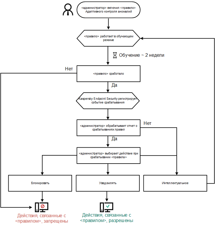 Администратор анализирует отчет о срабатываниях правил или содержание хранилища Срабатывание правил в состоянии Интеллектуальное обучение. Далее администратор может выбрать поведение Адаптивного контроля аномалий при срабатывании правила: блокировать или разрешить. Также администратор может продолжить отслеживать срабатывание правила и продлить работу приложения в обучающем режиме. Если администратор не предпринимает никаких мер, приложение также продолжит работать в обучающем режиме. Отсчет срока действия обучающего режима начинается заново.