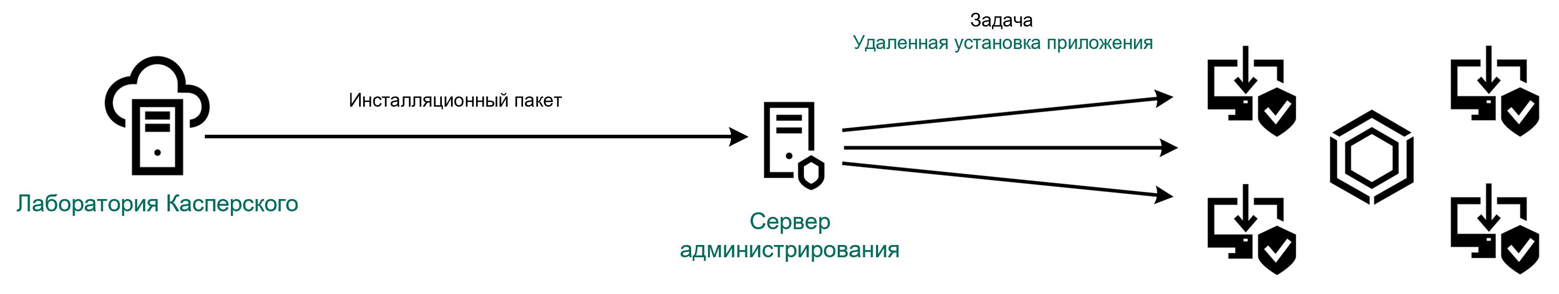 Для установки приложения на компьютерах организации в Kaspersky Security Center предусмотрен мастер развертывания защиты. Мастер развертывания защиты включает в себя следующие основные действия: