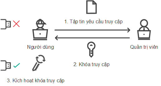 Bạn chỉ có thể cấp quyền truy cập đến một thiết bị bị chặn ở chế độ ngoại tuyến nếu Kaspersky Security Center được triển khai trong tổ chức và máy tính đó đã được áp dụng chính sách. Trong thiết lập của chính sách, trong phần Kiểm soát thiết bị, phải chọn Cho phép yêu cầu truy cập tạm thời.