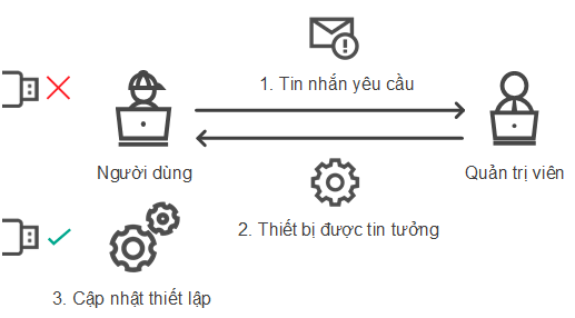 Nếu Kaspersky Security Center không được triển khai trong tổ chức của bạn thì bạn có thể cung cấp quyền truy cập tới một thiết bị trong thiết lập của Kaspersky Endpoint Security. Ví dụ như bạn có thể thêm thiết bị vào danh sách được tin tưởng hoặc tạm thời tắt Kiểm soát thiết bị.