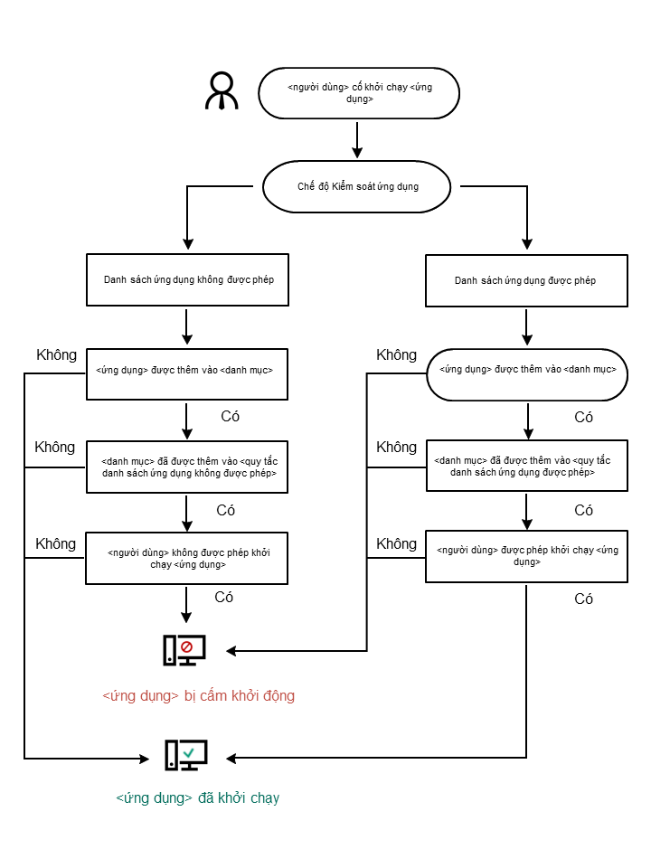 Kaspersky Endpoint Security sử dụng một thuật toán để đưa ra quyết định về việc khởi chạy một ứng dụng (xem hình bên dưới).