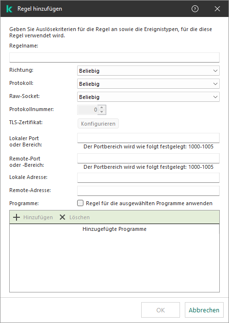 Kaspersky Endpoint Security kombiniert Kriterien für die Regelauslösung mit einem logischen UND.