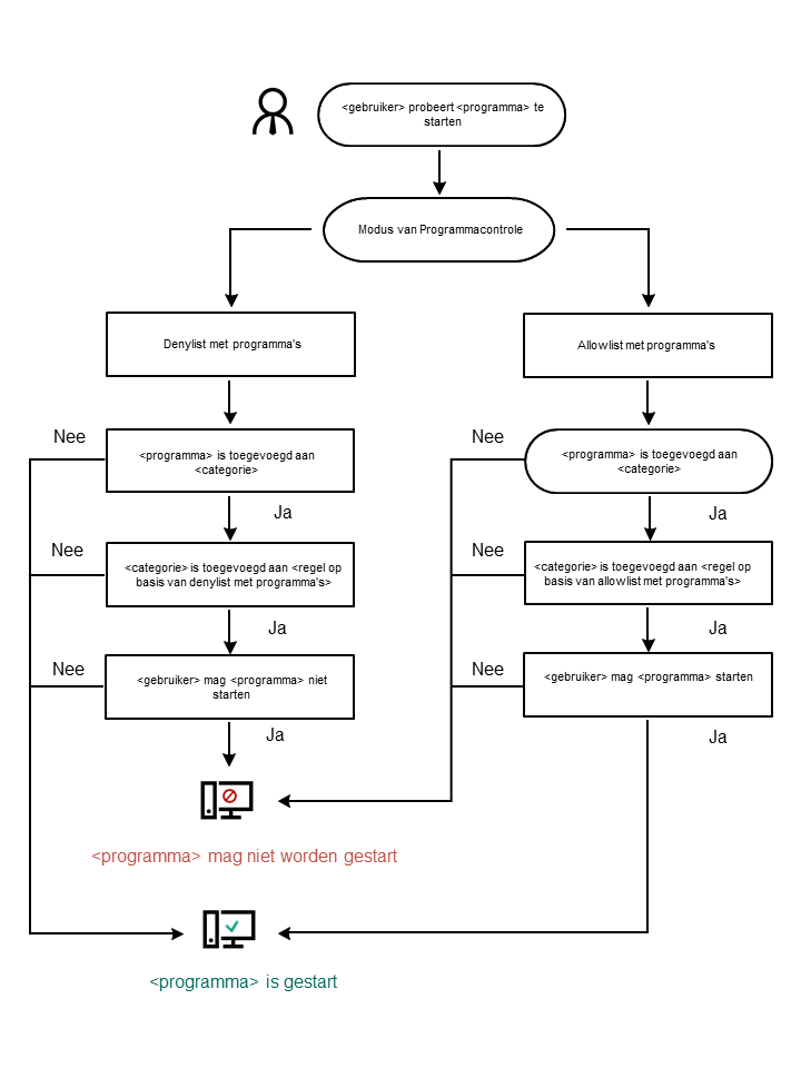 De beheerder maakt regels van programmacontrole in het beleid voor de beheergroep. De regel omvat de categorieën van programma's en de opstartstatus van programma's uit deze categorieën: geblokkeerd of toegestaan. De beheerder kan veel regels maken. Eén programma kan voldoen aan de criteria van meerdere regels. De prioriteit van een Blokkeren-regel is hoger dan die van een Toestaan-regel. Telkens wanneer het programma wordt gestart, controleert Kaspersky Endpoint Security of een programma overeenkomt met een regel. Kaspersky Endpoint Security vergelijkt het programma achtereenvolgens met alle regels van Programmacontrole.