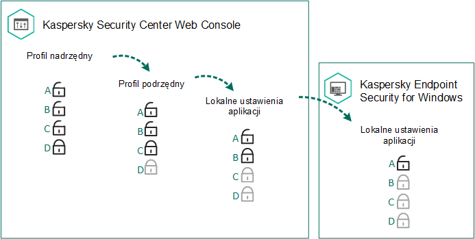 W wyniku tego działania ustawienia programu Kaspersky Endpoint Security zostaną skonfigurowane na komputerach klienckich podczas kolejnej synchronizacji. Możesz wyświetlić informacje o zasadzie stosowanej na komputerze w interfejsie Kaspersky Endpoint Security, klikając przycisk