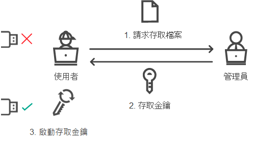 只有在組織中佈署了卡巴斯基安全管理中心且已將某個政策套用於電腦時,才能以線上模式授予對封鎖的裝置的存取權限。電腦必須能夠與管理伺服器建立連線。