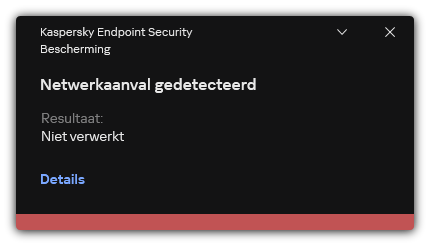 Wanneer Kaspersky Endpoint Security hierdoor een poging tot netwerkaanval tegen de computer van een gebruiker detecteert, blokkeert het alle netwerkverbindingen met de aanvallende computer. Kaspersky Endpoint Security creëert de Network attack detected gebeurtenis. De gebeurtenis bevat informatie over de aanvallende computer: IP- en MAC-adressen.