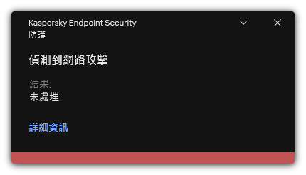 如果啟用網路威脅防護元件,Kaspersky Endpoint Security 會自動封鎖網路威脅。此外,該應用程式可以封鎖發動攻擊的電腦並在一定時間內限製傳送網路封包。預設情況下,Kaspersky Endpoint Security 會封鎖電腦一小時。
