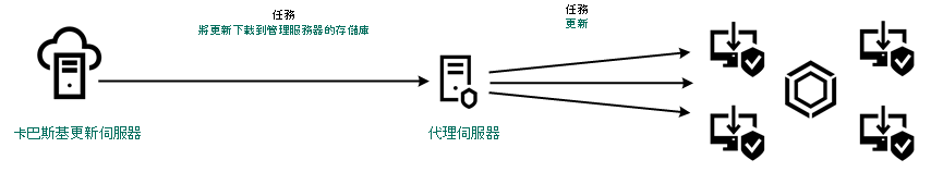 更新透過標準網路通訊協定從卡巴斯基更新伺服器或其他 FTP 或 HTTP 伺服器下載。如果存取更新來源需要連線代理伺服器,則在 Kaspersky Endpoint Security 政策設定中指定代理伺服器設定。