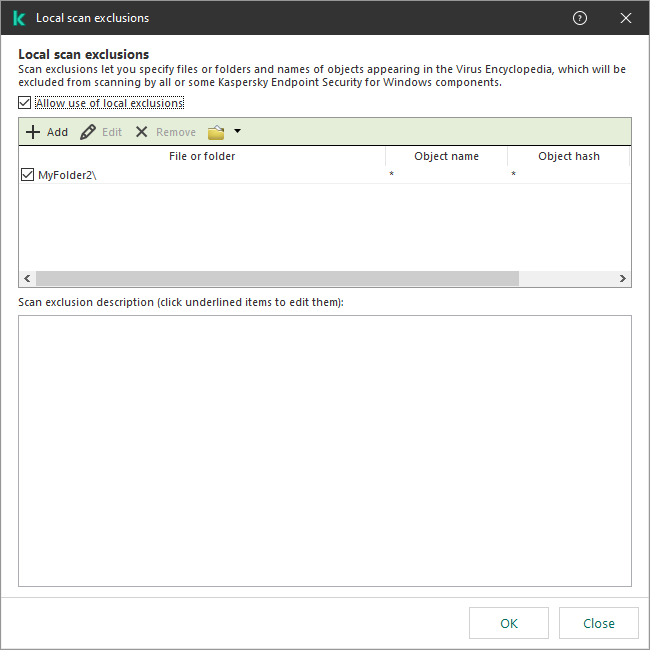 Kaspersky Endpoint Security hides the list of scan exclusions in the user interface of the application if configuration of scan exclusions is blocked by the administrator in the console ("closed lock" symbol) and local scan exclusions are prohibited (the Allow use of local exclusions check box is cleared).