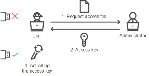 You can grant access to a blocked device in online mode only if Kaspersky Security Center is deployed in the organization and a policy has been applied to the computer. The computer must have the capability to establish a connection with the Administration Server.