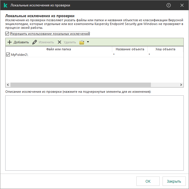 Если необходимо, в поле Комментарий введите краткий комментарий к создаваемому исключению из проверки.