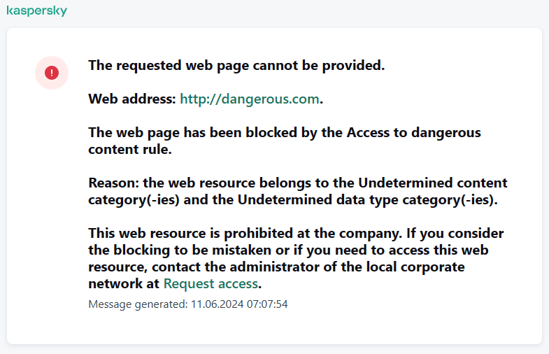 Message to administrator. Template of the message to be sent to the LAN administrator if the user considers the block to be a mistake. After the user requests to provide access, Kaspersky Endpoint Security sends an event to Kaspersky Security Center: Web page access blockage message to administrator. The event description contains a message to administrator with substituted variables. You can view these events in the Kaspersky Security Center console using the predefined event selection User requests. If your organization does not have Kaspersky Security Center deployed or there is no connection to the Administration Server, the application will send a message to administrator to the specified email address.