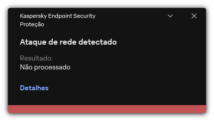 Como resultado, quando o Kaspersky Endpoint Security detecta uma tentativa de ataque de rede no computador do usuário, ele bloqueia todas as conexões com o computador atacante. O Kaspersky Endpoint Security cria os eventos Ataque de rede detectado. O evento contém as informações sobre o computador atacante: Endereços IP e MAC.