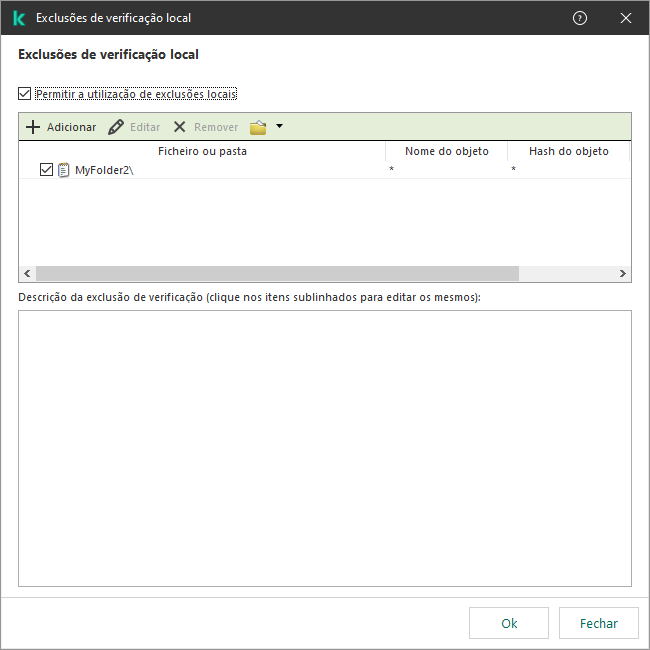 O Kaspersky Endpoint Security oculta a lista de exclusões de verificação na interface de utilizador da aplicação se a configuração de exclusões de verificação for bloqueada pelo administrador na consola (símbolo de "cadeado fechado") e se as exclusões de verificação locais forem proibidas (a caixa de verificação Permitir a utilização de exclusões locais está desmarcada).