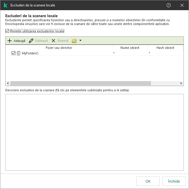 Dacă este necesar, în câmpul Comentariu, introdu o descriere succintă a excluderii de la scanare pe care o creezi.