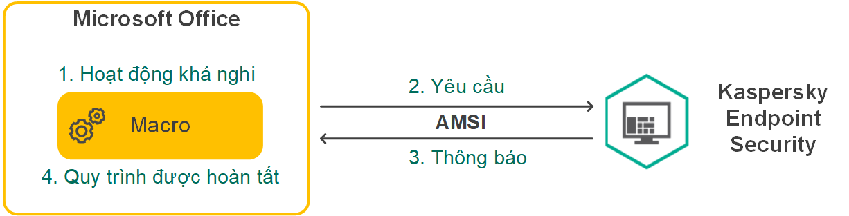 Thành phần Bảo vệ AMSI được dành để hỗ trợ Antimalware Scan Interface của Microsoft. Antimalware Scan Interface (AMSI) cho phép các ứng dụng thuộc bên thứ ba có hỗ trợ AMSI gửi các đối tượng (ví dụ như kịch bản PowerShell) đến Kaspersky Endpoint Security để quét bổ sung và sau đó nhận kết quả từ việc quét cho các đối tượng này. Các ứng dụng thuộc bên thứ ba ví dụ như các ứng dụng Microsoft Office (xem hình bên dưới). Để biết chi tiết về AMSI, vui lòng tham khảo tài liệu của Microsoft.