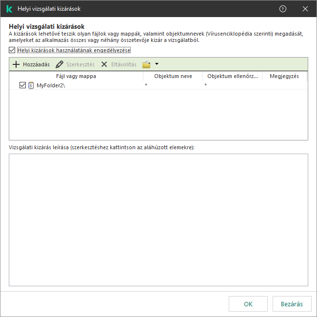 Új kizárás. A Kaspersky Endpoint Security egy új vizsgálati kizárást ad hozzá a lista gyökeréhez.