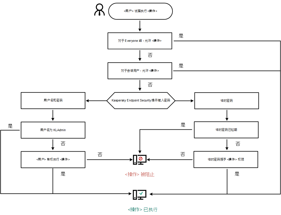 Kaspersky Endpoint Security 根据以下算法决定是允许还是阻止受密码保护的操作(请参见下图)。