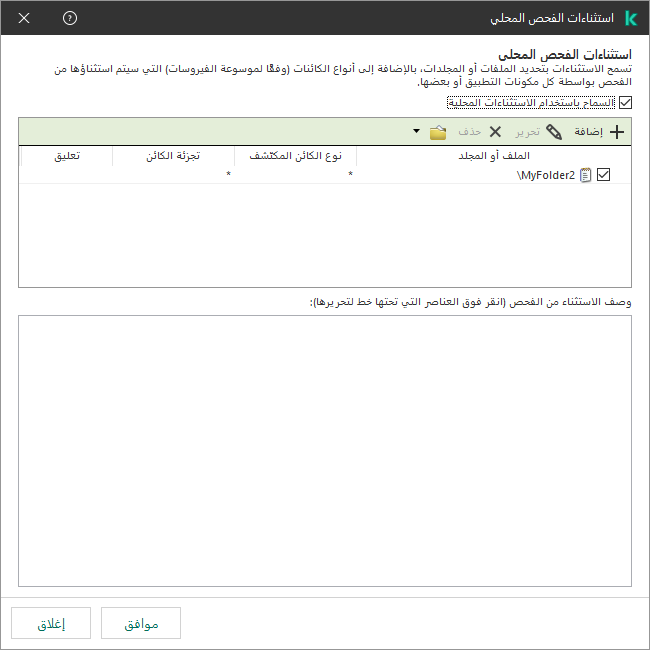 ستتم إضافة الاستثناء الجديد إلى القائمة. ويمكنك تعطيل الاستثناء في أي وقت باستخدام خانة الاختيار الموجودة في عمود الحالة.