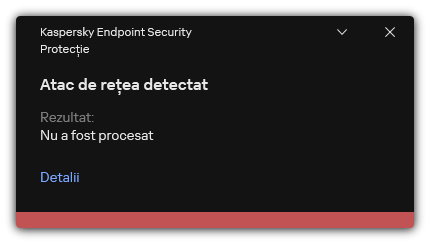 Prin urmare, atunci când Kaspersky Endpoint Security detectează o tentativă de atac de rețea lansată împotriva computerului utilizatorului, aceasta va bloca toate conexiunile cu computerul atacator. Kaspersky Endpoint Security creează evenimentul Network attack detected. Evenimentul conține informații despre computerul atacator: Adresele IP și MAC.