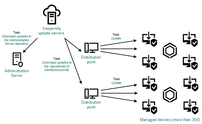 Abhängig von der Konfiguration Ihres Netzwerks können Sie die folgenden Schemata für das Herunterladen und Verteilen der erforderlichen Updates auf die verwalteten Geräte verwenden: