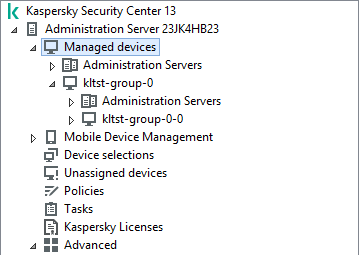 Inmediatamente después de la instalación de Kaspersky Security Center, la carpeta Dispositivos administrados contendrá únicamente una carpeta vacía Servidores de administración.