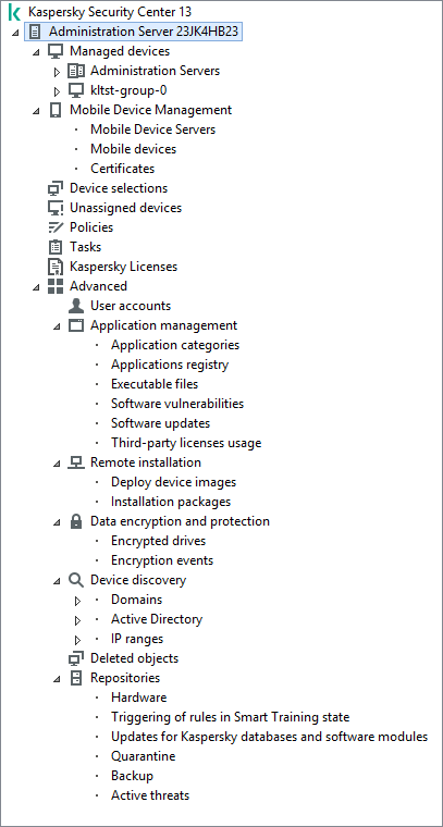 - Dispositivos administrados. La carpeta está diseñada para almacenar, mostrar, configurar y modificar la estructura de los grupos de administración, directivas de grupo y tareas de grupo.