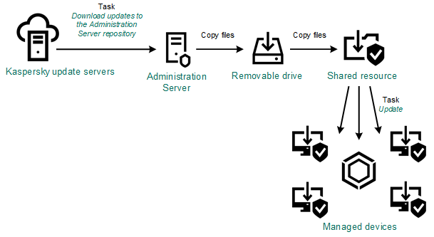 Si el Servidor de administración no tiene conexión a Internet, puede configurar la tarea Descargar actualizaciones en el repositorio del Servidor de administración para descargar actualizaciones desde una carpeta local o de red. En este caso, de vez en cuando debe copiar los archivos de actualización necesarios en la carpeta especificada. Por ejemplo, puede copiar los archivos de actualización necesarios desde uno de los siguientes orígenes: