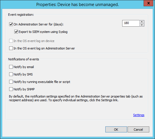 Dans la fenêtre des propriétés de l'événement qui s'affiche, cochez la case Exporter dans le système SIEM selon le protocole Syslog pour marquer les événements sélectionnés pour l'exportation au format Syslog. Décochez la case Exporter dans le système SIEM selon le protocole Syslog pour supprimer la marque des événements sélectionnés pour l'exportation au format Syslog.
