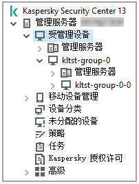 管理组的层次结构是在 Kaspersky Security Center 主程序窗口的“受管理设备”文件夹中创建的。管理组以文件夹形式显示在控制台树中(参见下图)。