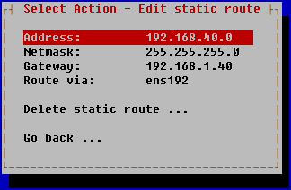 Pour modifier la carte réseau via laquelle l'itinéraire sélectionné passe, dans la fenêtre Select Action – Edit static route, sélectionnez l'option Route via, puis dans la fenêtre Select interface to set route via, sélectionnez la carte réseau pour l'itinéraire statique et appuyez sur la touche ENTER.