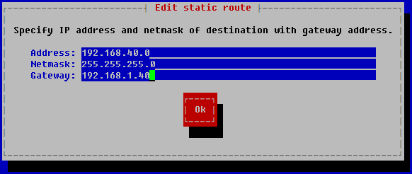 - 設定行を選択して ENTER を押し、[Edit static route] ウィンドウで TAB キーを使用して関連する設定を選択し、その値を編集して、[Ok]をクリックします。