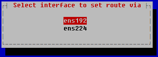 - 選択したルートのネットワークアダプターを変更する場合は、[Select interface to set route via]ウィンドウで[Route via]を選択し、静的ルートのネットワークアダプターを選択して ENTER を押します。