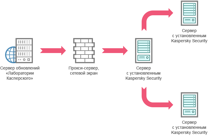 Вы можете обновлять базы и модули Kaspersky Security для Windows Server на защищаемых устройствах по следующим схемам: